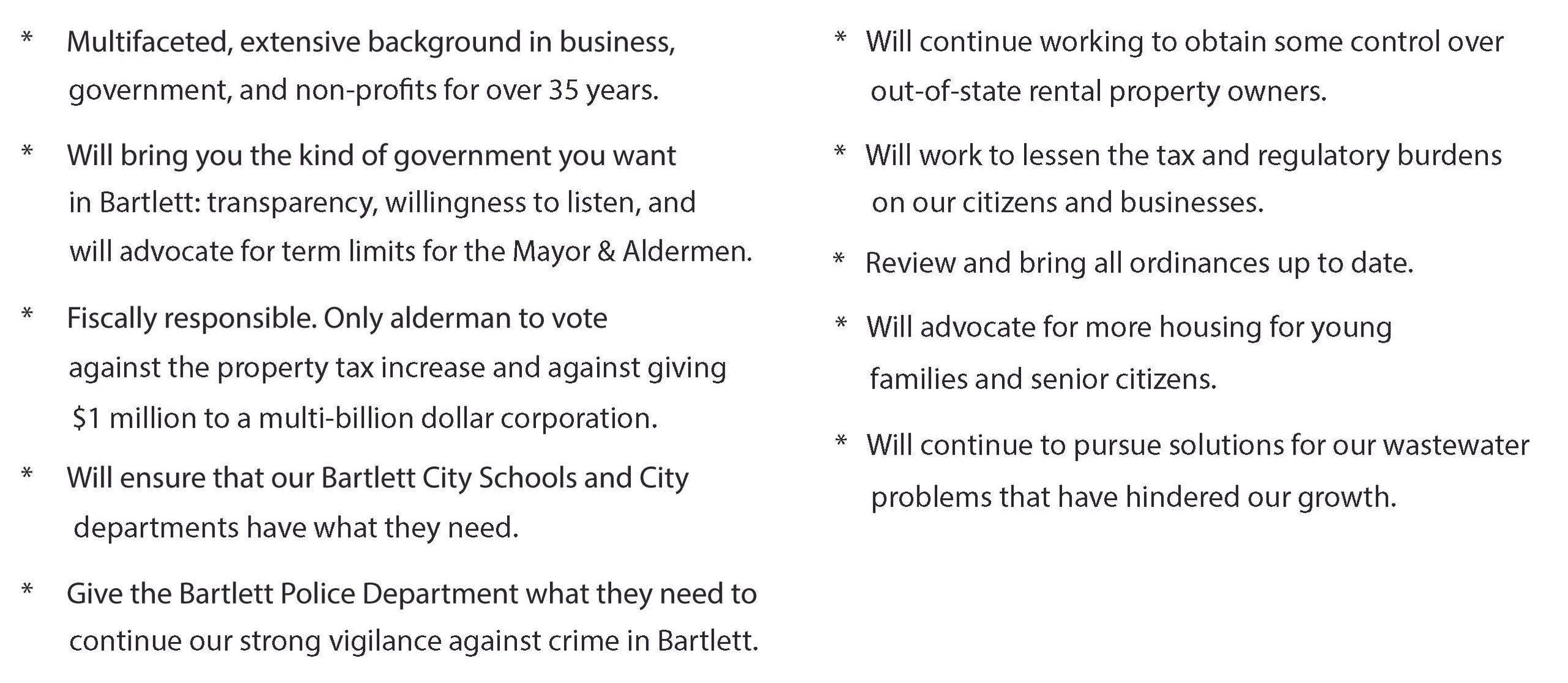The people of Bartlett are always ready to serve their neighbors. And that is my goal as well. I only make this run to serve you, and to work even harder to make Bartlett a better place for our children and grandchildren.